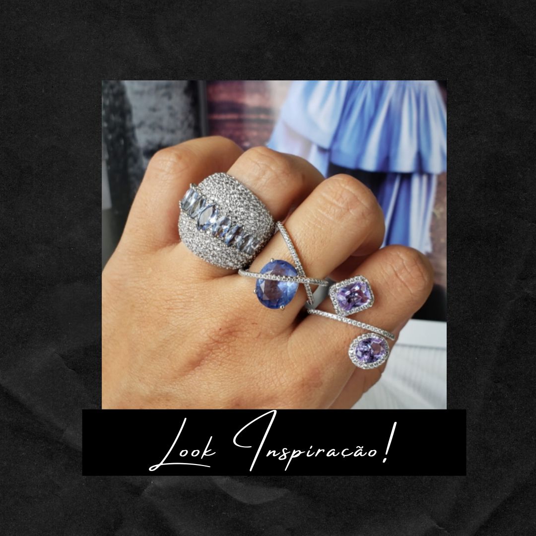 Anel da Linha Luxo, em Banho de Ródio Branco, com pedra em formato de gota na parte central da peça, essas pedras com tom Lilás são chamadas elegantemente de Tanzanitas de Zircõnias. Já toda a parte em torno das Tanzanitas, são pedras de Brilhantes Zircônias.