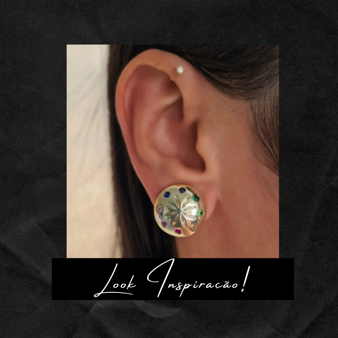 Brinco em formato redondo, estilo botão, com lindos detalhes de pedras de Zircônias Rainbow, em formato de pontos de luz. Na parte central da peça, tem um lindo detalhe de pétalas de flor, em linha reta.