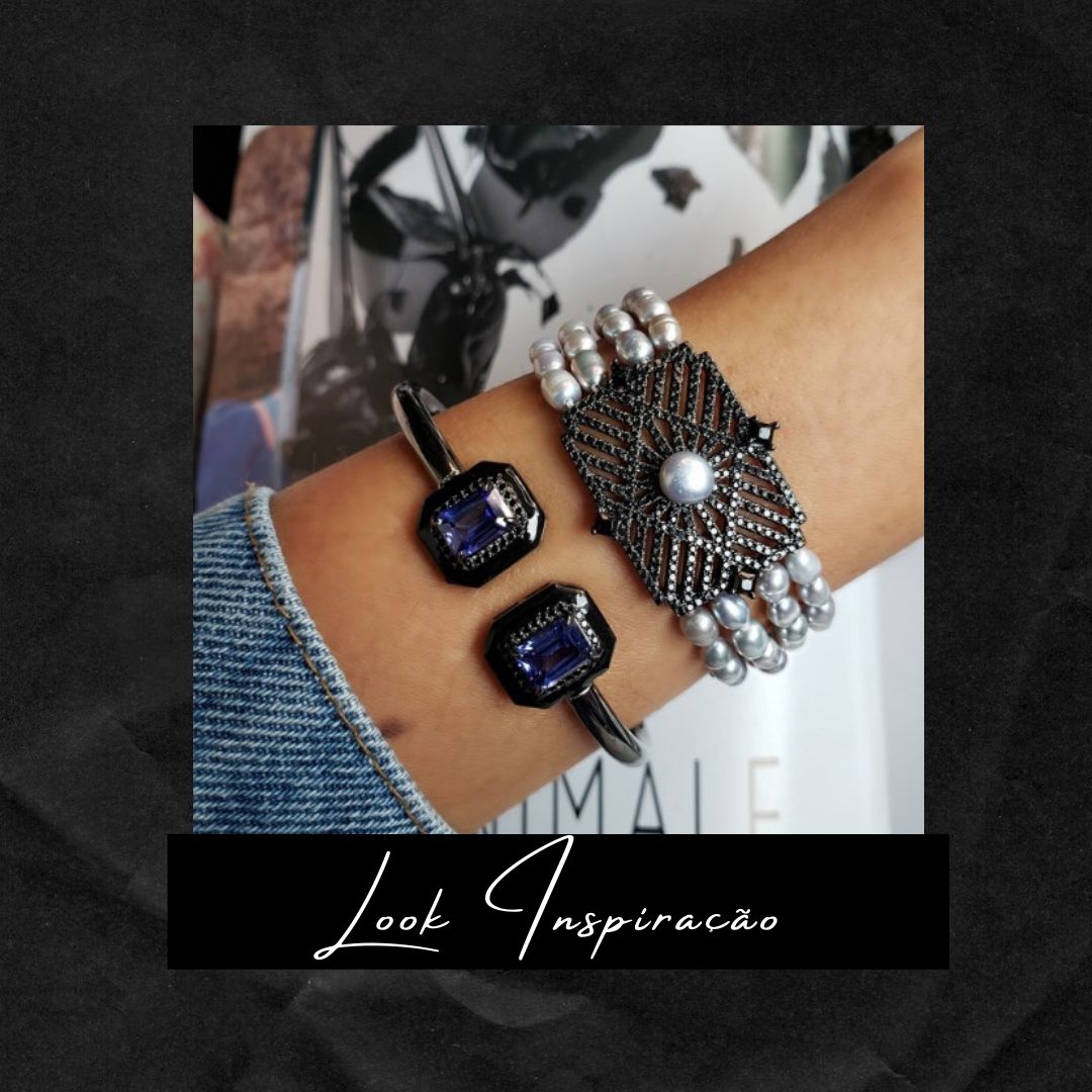 Esta pulseira, é em banho Ródio Negro, com lindas pérolas Shell na cor cinza, e o retângulo central, esta com finos acabamentos de Zircônias Pretas microcravejadas. Os demais detalhes da pulseira também são microcravejados com Zircônias Pretas.